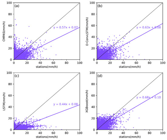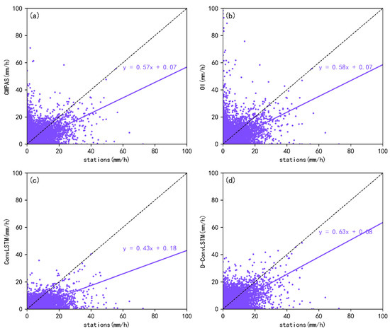Scatter plots of CMPAS and three models’ merged precipitation data ((a) CMPAS, (b) OI, (c) ConvLSTM, (d) D-ConvLSTM).