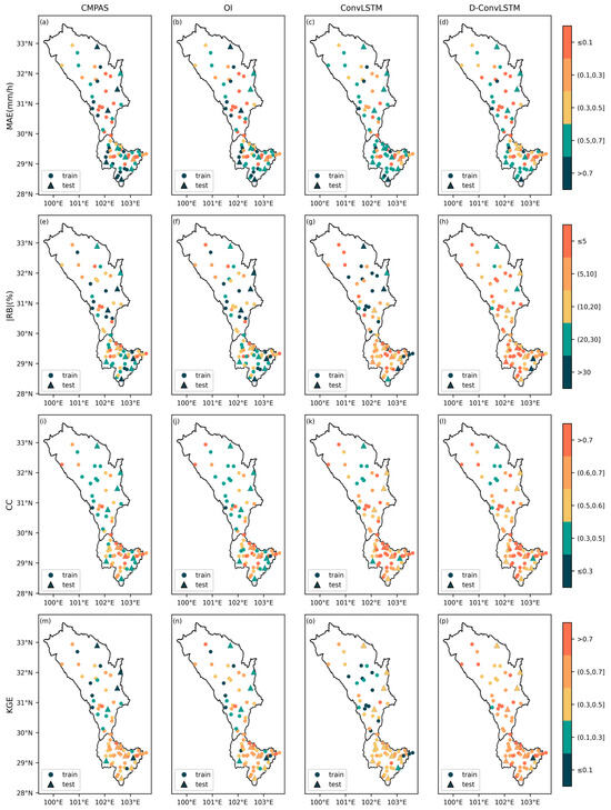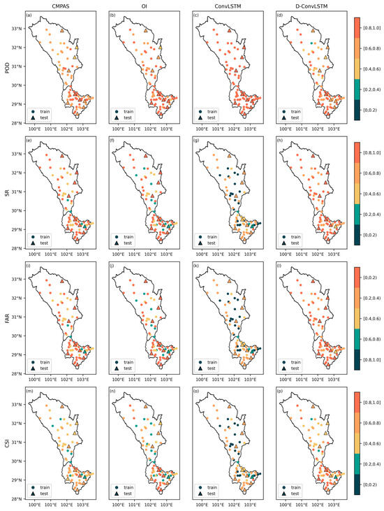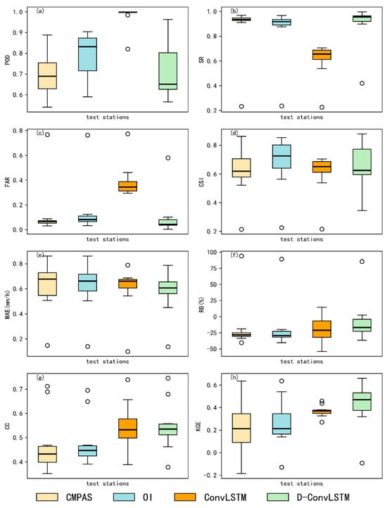 From Figure 7a–d, it can be concluded that, for the test stations, D-ConvLSTM and the OI improve the accuracy of precipitation identification primarily by enhancing the ability to capture rainfall (POD). D-ConvLSTM also shows some improvement in the FAR and SR, whereas OI shows a slight decline. ConvLSTM, conversely, increases the ability to capture precipitation at the cost of many false alarms, ultimately leading to a decline in overall precipitation identification accuracy, which is consistent with the overall performance conclusion in Section 4.1.