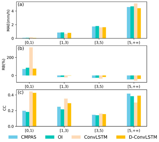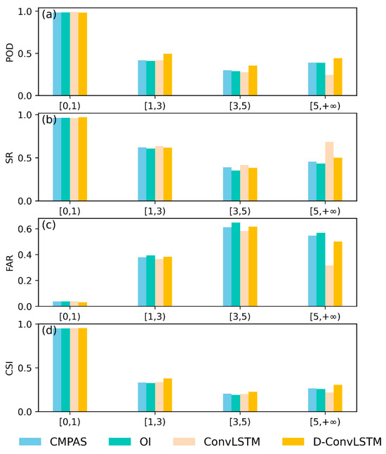 For the MAE (Figure 9a), it generally increases as precipitation intensity increases. The MAE of D-ConvLSTM is lower than the CMPAS across all precipitation intensity ranges, reducing it by 23.6%, 5.4%, 6.2%, and 3.9%, respectively. The MAE of the OI is almost the same as the CMPAS across all precipitation intensity ranges. The MAE of ConvLSTM is higher than the CMPAS in the ranges [0, 1) and [5, +∞) but lower in the ranges [1, 3) and [3, 5).