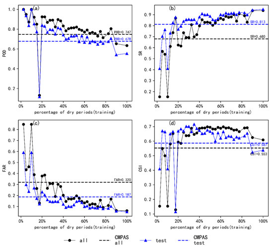This study also aims to investigate the impact of the training data distribution on the merging performance. For ConvLSTM-identify (1st layer), the strategy is to change the ratio of dry to wet data in the training set. For wet samples, considering that the number of dry samples far exceeds that of wet samples, we make no adjustments to wet samples and use all the data for training. For dry samples, we adjust the samples for training from 2.5% to 100%, increasing by 2.5% each time.
