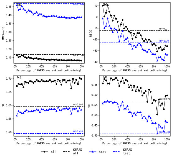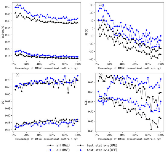 Owing to the poor KGE values of the original CMPAS across different precipitation ranges, the merged precipitation data from different models, although improved, still do not meet expectations. Therefore, those data are not displayed in Figure 8.