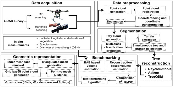 The process pipeline, as shown in Figure 1, consisted of a series of six core components: data acquisition, preprocessing, segmentation, tree reconstruction, benchmarking, and geometric representation.
