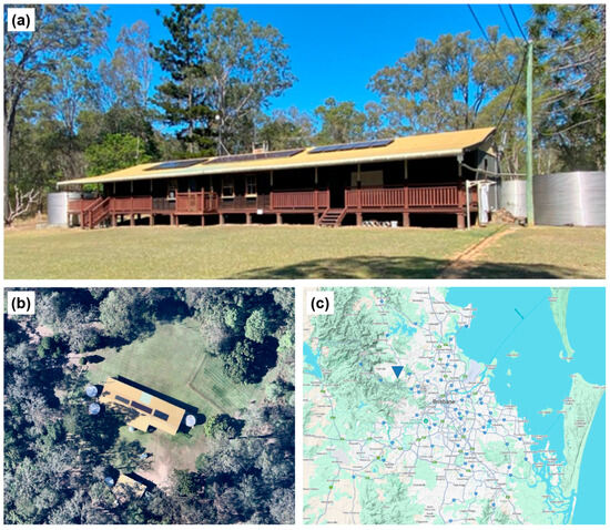The WUI study site in Samford, Queensland. (a) The elevated building in the study site. (b) The vegetation surrounding the elevated building. (c) Location of study site in relation to Brisbane, Queensland.
