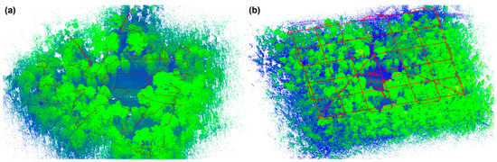 Survey paths (red lines) and point clouds generated from (a) handheld LiDAR survey and (b) UAS–LiDAR survey.