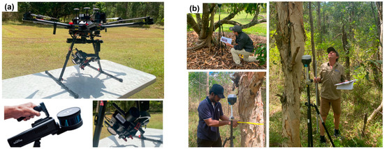 (a) UAS–LiDAR and handheld LiDAR survey and (b) in situ data collection including DBH and height of surrounding vegetation.