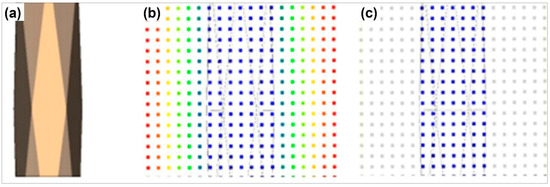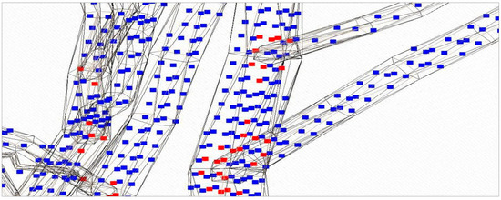 Where cylinders intersected within the mesh, which is a surface representation, we used a dot product-based indicator to differentiate the inner faces from the outer faces, so that the inner faces could be discarded (Figure 13). We then identified and removed the border faces from cylinder intersections (Figure 14) to produce the final mesh. Figure 15 shows a section of the completed voxelization in which the final mesh was successfully populated with the point cloud grid.