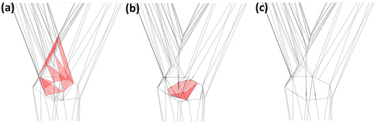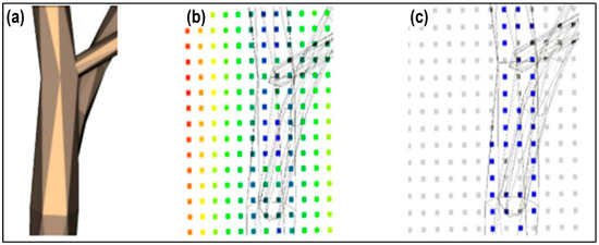 However, the reconstructed mesh does not only encompass the outer surface of the tree. The cylindrical representations of tree skeletons resulted in intersecting cylinders and intersecting faces at junctions where a parent branch had more than one child branch (Figure 6a). Points in the grid-based point cloud that were located within the parent branch and near the intersecting face (Figure 6b) were assigned distances with a positive orientation from the face. Without removing the inner faces, these voxels would have been excluded from the stem (Figure 6c).