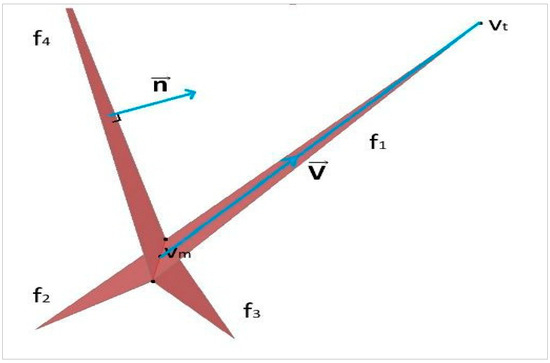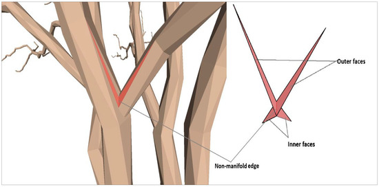 We employed a systematic approach to removing the two inner faces from each non-manifold edge, to leave only the outer faces in the reconstructed tree mesh. We initially organized the faces into pairs, with each pair comprising one inner face and one outer face (f1, f2 and f3, f4) characterized by the same normal vector direction (Figure 8).