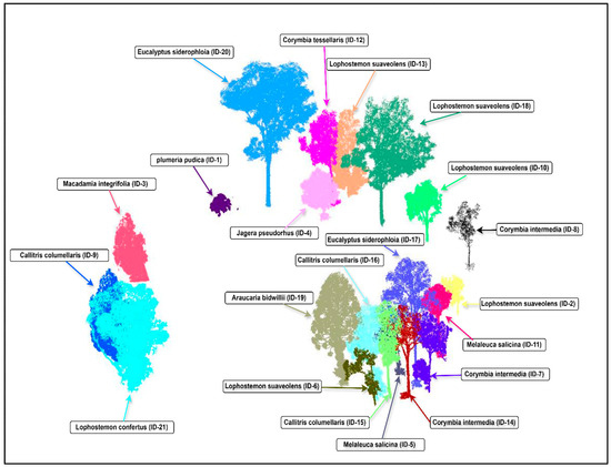 Figure 9 shows the output of the automated Raycloudtools segmentation, representing the 21 field-measured trees closest to the building, and the results of the manual segmentation of the same individual point clouds in CloudCompare. Based on the 21 classes represented in the manual CloudCompare segmentation (one class for each tree), the automated segmentation using Raycloudtools achieved an average accuracy of 98%, with 90% precision, 87% recall, and an F1-Score of 87%. Despite some confusion with merging canopy areas, adequate spacing between trunks enabled accurate segmentation of individual trees.