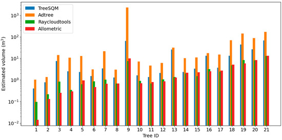 The BAE-based volume estimates were compared with the volumes of the tree reconstructions produced by each of the three tools (Figure 10). Root mean square errors (RMSE) and coefficients of correlation (R2) were calculated to evaluate the performance of each tool (Table 6). The Raycloudtools volume estimation achieved a higher R2 (0.972 vs. 0.525 and 0.908) and a RMSE two orders of magnitude lower than AdTree and TreeQSM (8.5 × 10−1 vs. 5 × 102 and 2 × 101).