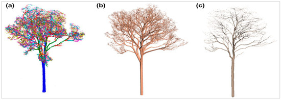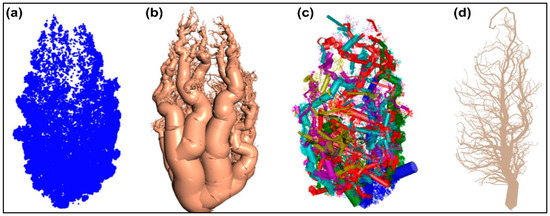 LiDAR scans using UASs are particularly suitable for collecting high-resolution structural data at close range compared to alternative methods [14]. This combination captures essential measures, including building location and design elements, structural vegetation characteristics, and topographic slopes, resulting in a complete point cloud representation of the surveyed area. This high-density point cloud enables the structural geometry and topology of vegetation to be accurately reconstructed [16]. Point clouds are now frequently used to reconstruct trees and other vegetation, aided by advances in computing capability and procedural modelling algorithms [17]. These advances have superseded earlier methods of vegetation modelling that were based on rules and repeating patterns [17]. Tree reconstruction with procedural modelling algorithms is a multi-step process, which involves the creation of a three-dimensional (3D) triangulated mesh from a 3D point cloud. The mesh is created by first constructing a tree skeleton, which depicts the trunk and main branch structures as an ensemble of straight or tapering cylinders [18]. Branch surfaces are then geometrically reconstructed and added to the skeleton [19]. Cylindrical geometry is used because it produces robust and reliable quantitative structural models (QSMs) and highly accurate estimates of dimensions such as length, diameter, angle, orientation, and volume [19,20,21].