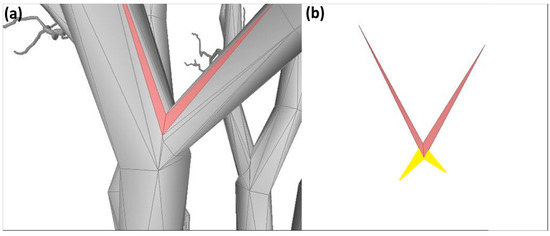 For the purpose of removing inner faces from the reconstructed mesh, we employed a segmentation process whereby intersecting faces were partitioned along the intersecting line. Initially, curvature flipping optimization was conducted using the MeshLab tool (Version, 2022.02) [44] to eliminate folded faces during the reconstruction process. Then, using the Blender software (Version, 3.6) [45], these intersecting faces were partitioned and triangulated. This resulted in a series of non-manifold vertices, where each plane was divided into an inner face and outer face, with the normal vector oriented away from the corresponding cylinder axis, producing a set of four interconnected faces (Figure 7).