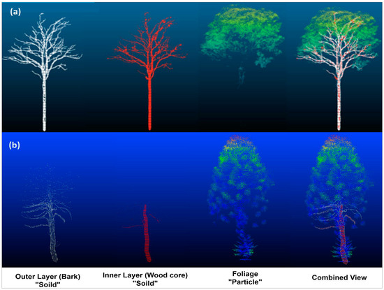 Wooden core and bark classification was based on the proximity of points to the final mesh that we reconstructed from the voxelized point cloud grid. Foliage points were obtained by filtering the points closest to the mesh reconstructed from the LiDAR point cloud. This removed the points associated with the main branches. Points associated with branches less than 2 cm thick were then considered as foliage points. In the reconstruction of tree crowns, we considered only the main branches contributing to the tree skeleton. Figure 16 shows the results of this classification process for a Eucalyptus siderophloia (deciduous tree) and Araucaria bidwillii (coniferous tree), in which points were designated as wooden core, bark, or foliage.