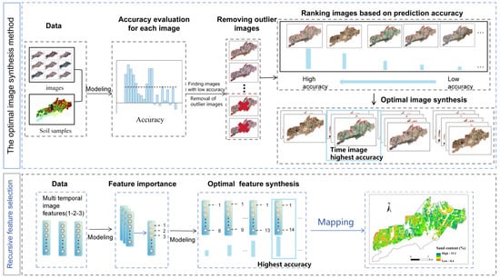 To enhance the prediction accuracy of the remote-sensing mapping of the sand content, this study first employs a multi-temporal RS image synthesis approach based on image selection, termed the optimal temporal phase synthesis method. This synthesis method first sorts the images according to the prediction accuracy of each image and then uses only the first few images for the synthesis and the resulting soil map. The optimal number of images is determined only by the sand prediction accuracy to mitigate the effect of less accurate images on the prediction []. The main process is as follows: