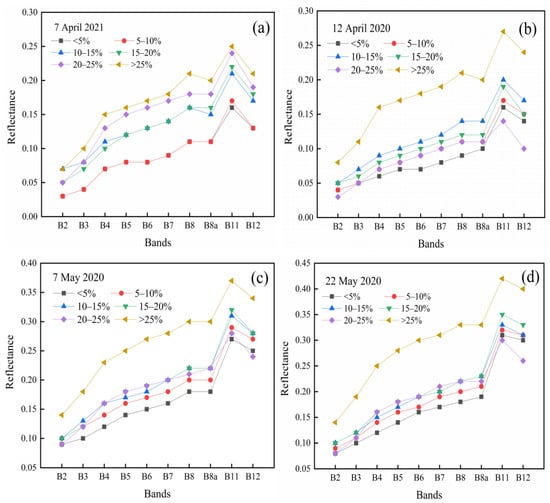 Spectral curves of Sentinel-2: (a,b) Spectral characteristic curves for different sand grain contents in April, (c,d) Spectral characteristic curves for different sand grain contents in May.