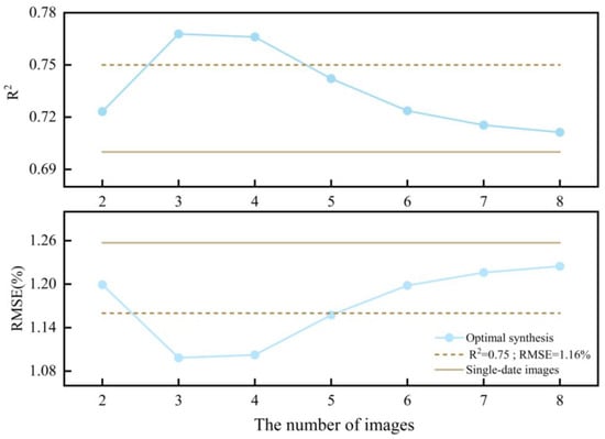 Prediction results of sand content for different number of images based on the optimal temporal phase sequencing method. The yellow line indicates the best result for a single-date image.