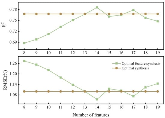On the basis of the 19 features obtained by recursive feature screening, in order to further optimize the model, we constructed the model one by one by superposition starting from the eighth feature and analyzed the prediction effect of different feature combinations. The results show that as the number of features increases, the prediction accuracy first improves significantly and then experiences small fluctuations. The prediction accuracy peaks with an R2 of 0.79 and an RMSE of 1.05% when the number of features is 14 (Figure 5). The accuracy is improved by an average of 3% compared to a model that uses only recursive feature screening.