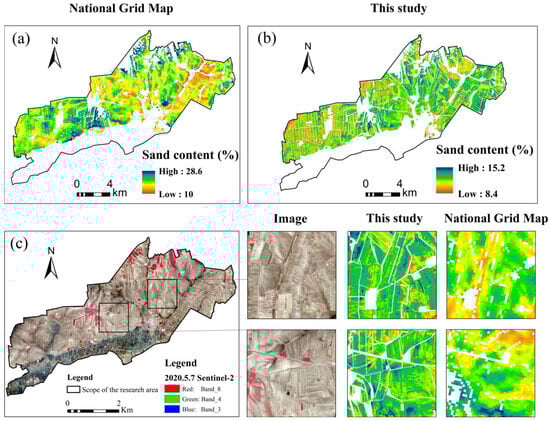 Spatial distribution and accuracy of the sand content of the mapping product (double preferred) proposed in this study compared to other products. (a) Spatial distribution of sand content in the National Grid Map product, (b) Spatial distribution of sand content in the product of this study, and (c) Comparison of the two products.