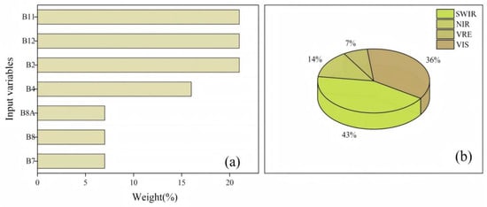 The model accuracy was further improved in this study through feature preference. Among the 14 features selected, the weights of these variables were analyzed, as shown in Figure 9a, and the results show that the three bands with the highest percentage are b11, b12, and b2. Meanwhile, the percentage of different types of bands is shown in Figure 9b, in which the short-wave infrared bands (b11 and b12) have the highest percentage, which reaches 43%, and the visible bands (b2 and b4) are the next highest, with a percentage of 36%; The near-infrared bands (b8 and b8A) account for 14%, and the red-edge band (b7) accounts for the least, 7%.