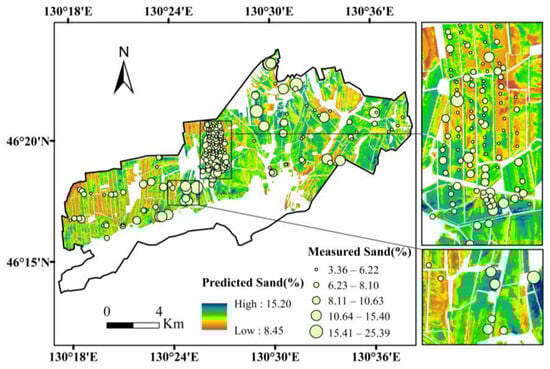 Soil texture, which refers to the relative proportions of different-sized particles (sand, silt, and clay) in a soil, is the most important indicator of the physical properties of soil, and has an important impact on soil fertility, structure, tillage properties, water retention, and plant growth [,]. As it is one of the components of soil texture, understanding the spatial distribution characteristics of sand plays a very important role in improving the efficiency of land resource utilization, crop yield, and environmental protection [,]. Planosol is widely distributed in the Sanjiang Plain within Heilongjiang Province, and is the main cultivated soil in the region. However, the planosol itself is characterized by shallow tillage, low nutrient content, and intolerance to drought and flooding, making its crop yield low and unstable []. Understanding its sand distribution characteristics is important for soil improvement. Sand content directly affects the structural and physical properties of the soil, such as permeability, water holding capacity, and drainage [,]. In cohesive soils such as planosol, accurate prediction of sand distribution can identify key amelioration zones, rationalize sand ratios, and significantly improve soil permeability and nutrient retention, thus improving tillability and soil and water conservation, and promoting crop growth. In addition, sand content is relatively stable in time, and unlike dynamic soil properties such as organic carbon, nutrients, and moisture, the stability of sand content makes it a highly accurate and actionable target for prediction, providing reliable data to support the implementation of soil improvement programs and is an important basis for decision-making in land management, farmland monitoring, and land use planning [,]. Therefore, the accurate spatial prediction of sand content is crucial.