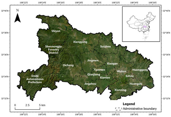 The study area, Hubei Province, is located between latitudes 29°05′53″N and 33°6′47″ N and longitudes 108°21′42″E and 116°07′50″E in the subtropical zone of China (