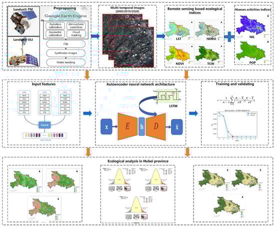 This study established a framework tailored to the ecological environment assessment of Hubei Province, which expands the indicator components of the EI based on multi-temporal remote sensing data from the Landsat series, WorldPop, and NPP-VIIRS sources. It incorporates an autoencoder neural network architecture, which is a deep learning method, to improve traditional index fitting methods by introducing the DRSEI. This model provides theoretical support for an accurate assessment of the ecological environment and a better understanding of the patterns of ecological environment change. It was applied here to study the ecological environment of Hubei Province, which was evaluated over the past 20 years, and analyze the spatiotemporal changes and evolutionary characteristics of ecological environment quality. A flowchart of the proposed framework is shown in