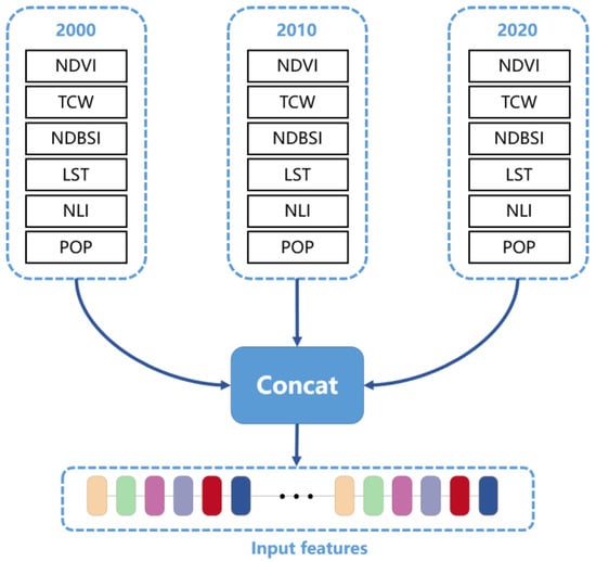 Figure 4, the 18 indicator components from 2000, 2010, and 2020 were concatenated into a single image. Specifically, each year has six indicator components (NDVI, TCW, NDBSI, LST, NLI, and POP). The raster feature values consisted of numerical components from different years and indicators, and the merged image served as input data for the autoencoder architecture. This approach not only enhances the model’s temporal efficiency but also improves the computational performance by considering the correlations of the ecological environment at the same location across different times during training.