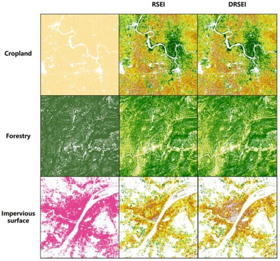 Figure 7, for cropland land use/land cover type identification, both models produced results with clear boundaries and essentially matched the actual distribution characteristics. Furthermore, the DRSEI identification results exhibited more continuous spatial distribution changes, whereas the RSEI results were more dispersed and showed noticeable point-like features. In the identification of forested areas, the overall recognition results of both models were consistent. The DRSEI provided richer layering in its results, especially in the identification of areas along riverbanks, which were more distinct than those identified by the RSEI, which showed less-clear riverbank areas and less-defined boundaries. For impervious surface land use type identification, the DRSEI detected two large areas of impervious surfaces within the region that were aligned with the urban areas of the region.