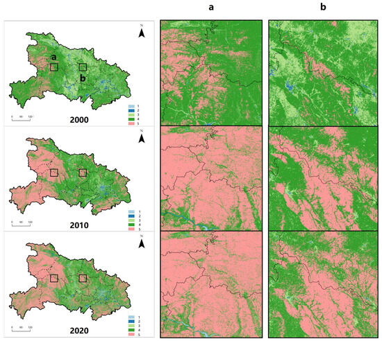 In this study, we calculated six component indicators for 2000, 2010, and 2020. The indicators were normalized as shown in the spatial distribution in