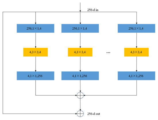 The module uses residual connections to focus on the errors in the network. The network uses 32 convolutional kernels, corresponding to dividing the feature map into 32 groups according to channels, extracting features from each group, and then concatenating them together.