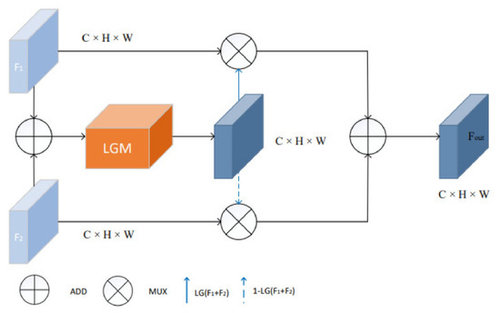 In the above formula, “LG” represents the local–global attention extraction module proposed in the previous section, “” and “” represent the two input features to be fused, and “⊕” and “⊗”, respectively, denote element-wise addition and multiplication, which are used for the preliminary fusion of features and the weighted mapping between features and attention.