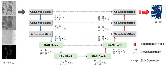 On the basis of these considerations, we utilize the UKAN. This model introduces KAN layers in both the encoder and decoder to increase the adaptability of the model to complex scenes and its ability to capture detailed features. Specifically, the encoder uses convolutional layers to extract low-level features, followed by KAN layers for global feature modeling; the decoder gradually restores spatial resolution and improves feature fusion through skip connections and KAN layers. This design enables the model to maintain parameter efficiency while possessing stronger feature representation capabilities, which is highly important for the accurate extraction of flood inundation extents.