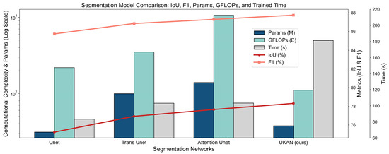 The UKAN model has a parameter count of 37.54 M, which is significantly lower than those of Trans U-Net and Attention U-Net. Compared with traditional U-Net, the parameter count of UKAN is slightly greater, but the performance improvement is more significant. In contrast, although Attention U-Net introduces an attention mechanism and improves segmentation performance, its parameter count and computational load increase substantially—the parameter count is nearly four times that of UKAN, and the number of GFLOPs is approximately ten times greater—making it less suitable for deployment in resource-constrained environments. Owing to its use of the transformer structure, Trans U-Net also suffers from large parameter sizes and high computational complexity. While the traditional U-Net has lower parameter counts and computational demands, its performance is clearly inferior to that of UKAN. This finding demonstrates that UKAN achieves high performance while balancing parameter efficiency and computational efficiency, offering greater practical application value. In terms of training time, UKAN requires 181.41 s per epoch, which is significantly higher than other models. This difference primarily stems from the complex KAN layer structure introduced in UKAN. While KAN layers, by using learnable activation functions, effectively enhance the model’s performance and feature modeling capabilities, they also increase the computational burden during training.