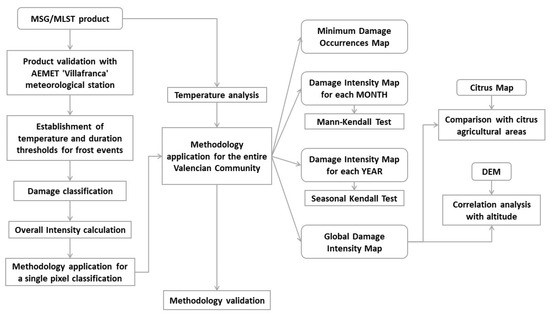 Citrus cultivation represents one of the major economic pillars of the Valencian Community (Spain). Frost events pose a significant threat to these plantations, resulting in substantial economic losses. This study aims to assess the frequency and intensity of frost occurrences in the region from 2004 to 2023, using Meteosat Second Generation satellite imagery. These images provide daily land surface temperature data at 15 min intervals. Frost days were defined as those when temperatures fell below −2.3 °C, the threshold at which orange fruits become susceptible to damage, with different temperature thresholds applied to estimate varying levels of crop damage. Frost duration was also analyzed to classify event intensity and its potential impact on citrus crops. Annual comparisons revealed a decline in both the severity and frequency of frosts, particularly in cases of “moderate” and “intense” damage, supporting forecasts of increased regional aridity and suggesting new opportunities for expanding citrus cultivation to higher altitudes. When compared with farmers’ records, this study’s methodology proves effective in assessing frost impact and offers potential use for winter crop insurance. Validation was conducted using in situ data from the Spanish National Meteorological Agency (AEMET).