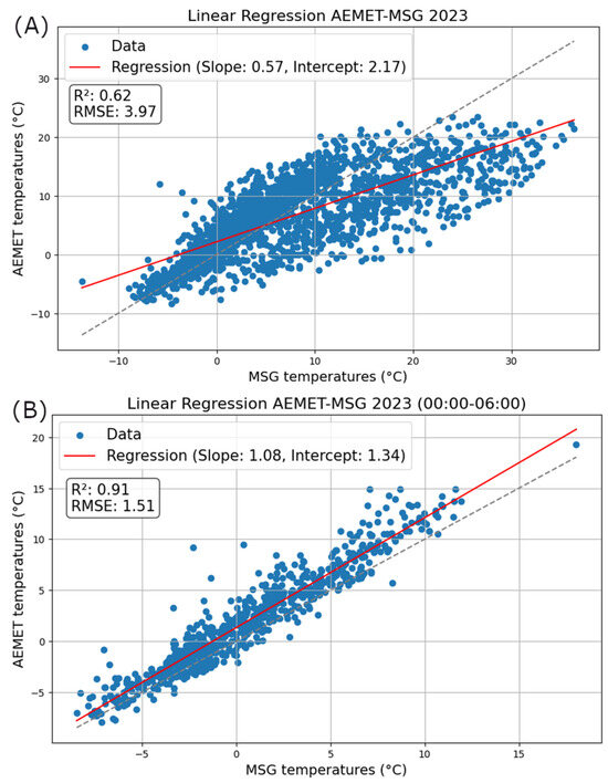 Linear correlation graphs between Meteosat LST data and air temperature data from the Villafranca weather station for the year 2023 for all data (A) and only for the night hours (from 00:00 to 06:00) (B).