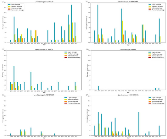 Bar graph illustrating the total number of frost occurrences recorded in the Villafranca area during the study period (2004–2023). The frosts are categorized by the extent of the damage produced, which is depicted through different colors. The figure consists of six subfigures, labeled (A–F), representing each month: January, February, March, April, November, and December, respectively.