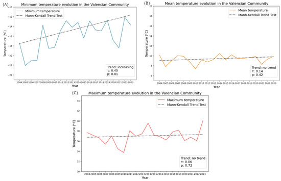 Evolution of the annual average minimum (A), mean (B), and maximum (C) land surface temperature in the Valencian Community from 2004 to 2023. The figures include the results of the Mann–Kendall trend test and its corresponding regression line.