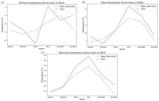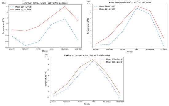 The temperature anomalies for 2023 were then compared to the rest of the time series for minimum, mean, and maximum temperatures (Figure 10). It was observed that in all three cases, the temperatures were higher for most months, confirming that 2023 was an exceptionally warm year. Additionally, a comparison between the decades 2004–2013 and 2014–2023 (Figure 11) revealed that temperatures were consistently higher in the latter decade across all cases.