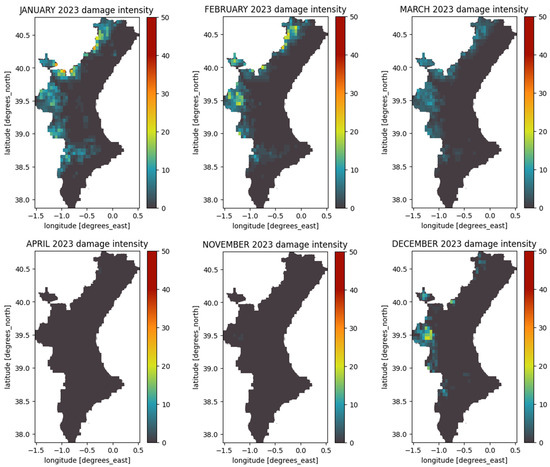 Damage intensity maps for the Valencian Community in January, February, March, April, November, and December of 2023, with the entire study period (2004–2023) displayed in Appendix A, Figure A2.