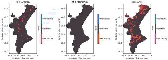 Result maps of the Mann–Kendall test conducted for the months of January, February, March, April, November, and December during the period 2004–2023, in the Valencian Community area.