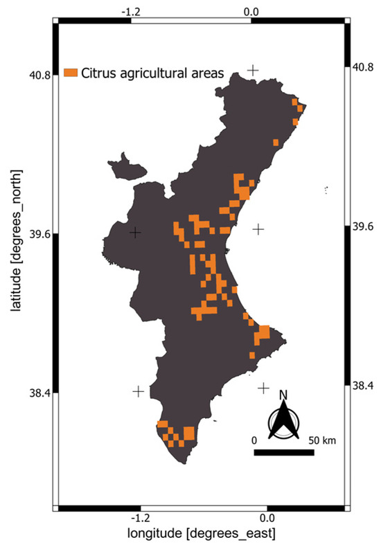 To verify whether the citrus crops in the region are indeed affected by frost, we compared our results with the distribution map of citrus agricultural areas provided by the “Centro de Descargas” of the Spanish National Geographical Information Centre (https://centrodedescargas.cnig.es/CentroDescargas/home, accessed on 1 September 2023). This map (https://datawrapper.dwcdn.net/ijvLp/1/, accessed on 1 September 2023) was derived from data from the Valencian Community Ministry of Agriculture, Fisheries, and Food, updated to 2022 (Figure 2), and has a spatial resolution of 10 m, covering the Valencian Community.