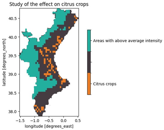 Overlay map of areas where above average intensity frosts occurs, and areas cultivated with citrus in the Valencian Community.