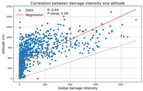 Linear correlation graph between the overall frost damage intensity registered over the study period (2004–2023) in the Valencian Community and altitude.