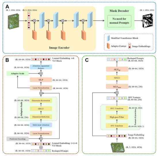where i denotes each individual adapter between ViT layers. and stand for the embedding features and High-Frequency Components (HFCs) features, respectively. In the Multi-Layer Perceptron (MLP) components, generates prompts from the combined embedding and HFC features. The GELU (Gaussian Error Linear Unit) activation function is then applied to introduce nonlinearity. Finally, adjusts the dimension of the generated prompts. These dimension-adjusted prompts are subsequently input into the next layer of transformer blocks, along with the image embedding features. The mask decoder remains unchanged with no given prompt inputs. The architecture is shown in Figure 2A.