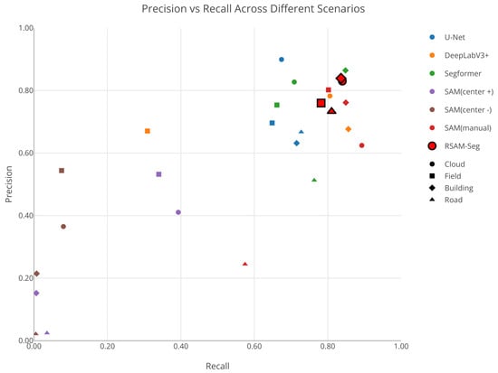 As shown in Table 2, RSAM-Seg demonstrates remarkable performance across all scenarios (Cloud, Field, Building, and Road). Figure 5 also showcases the vs. diagram of different methods across all scenarios. In the Cloud scenario, RSAM-Seg achieves the highest performance for the index, score, and while maintaining competitive performance in other metrics. In the Road scenario, RSAM-Seg outperforms all other methods in most metrics, including the index, , , score, and . In cases where RSAM-Seg ranks second, such as in the Field scenario, it is mostly surpassed by SAM with manual annotations, demonstrating comparable results while maintaining automation. Furthermore, RSAM-Seg significantly outperforms the original SAM model for center point prompts across all scenarios, validating the effectiveness of our proposed improvements.