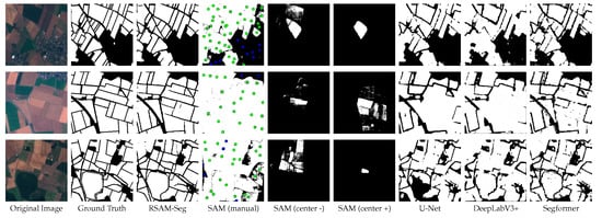 In this section, we evaluate the performance of RSAM-Seg compared to the original SAM, DeepLabV3+, Segformer, and U-Net models on four binary and two multi-class datasets. To maintain experimental fairness, all models were evaluated using identical preprocessing protocols, training settings, and hardware configurations. When evaluating the performance of SAM, the operational mode was carefully considered, which is crucial for fair comparison. SAM operates in point mode, with two variants: center(+) and center(−), where the center point is labeled as a positive or negative class, respectively. The evaluation utilizes center point co-ordinates as prompts, and the results were compared against manual annotations [76].