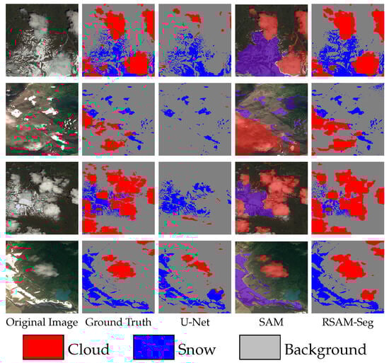 The quantitative results of various methods in the cloud scenario are summarized in Table 2, and the visualization results are listed in Figure 6. From the cloud scenario in Table 2, RSAM-Seg significantly exceeds the basic SAM in all metrics. Compared to U-Net, RSAM-Seg exhibits superior performance in four comprehensive metrics: the index, score, overall accuracy, and . RSAM-Seg demonstrates an average superiority over SAM under both modes by 36.7%. From the images in the first row of Figure 6, it is evident that RSAM-Seg performs well, especially when distinguishing thin cloud segments on the right. In contrast, SAM struggles to accurately identify cloud formations, resulting in large cloud areas being grouped into a single category. DeepLabV3+ is able to segment thin clouds more accurately but performs poorly when dealing with the more dispersed clouds on the left. U-Net and Segformer perform well in both scenarios.