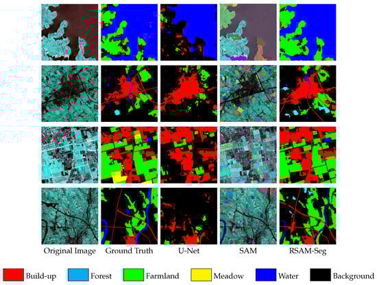 The Gaofen Image Dataset (GID) was selected as a land-cover scene dataset to evaluate the multi-class segmentation performance of RSAM-Seg. GID is a subset of Gaofen-2 (GF-2) satellite imagery, comprising 150 images with corresponding pixel-level annotations [75]. This dataset includes six semantic segmentation categories: build-up, farmland, forest, meadow, water, and background. The GF-2 satellite offers high-resolution imaging with a spatial resolution of 0.8 m for panchromatic and 3.2 m for multi-spectral images, a swath width of 45 km, and a 5-day repetition cycle, facilitating detailed and comprehensive multi-class segmentation analysis. Each image in the GID has a resolution of 7300 × 6908 pixels, with a total of 150 images. Due to computational constraints in our experiments, these images are cropped into patches of 1024 × 1024 pixels, and we created a subset of 3000 patches in total, which were split into 2400 patches for training, 300 annotated patches for validation, and 300 unlabeled patches for testing (8:1:1 ratio).
