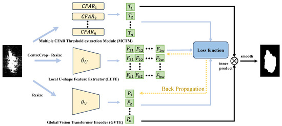 Section 3.2 introduces the Multiple CFAR Threshold-extraction Module (MCTM). The input image is first divided into the noise region and the object region. We count all pixels in the noise region and obtain corresponding thresholds according to different false alarm rates, and finally obtain a set of threshold vectors , where N indicates the number of false alarm rates. Section 3.3 introduces the Local U-shape Feature Extractor (LUFE). We feed the image into the LUFE and obtain the pixel-level feature , where C, H, and W denote the channel, height, and width of the feature map. Section 3.4 introduces the Global Vision Transformer Encoder (GVTE). We feed the image into GVTE and obtain a set of probability vectors , where denotes the probability of . We define the final adaptive threshold as