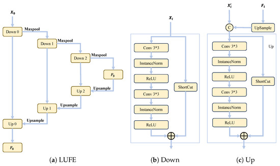 where Down () and Up () are the Down model and Up model designed by us, respectively. Their structures are shown in Figure 3b,c, respectively. The internal structure of the two models is the same, and both use two convolutional neural networks with kernel sizes of , two InstanceNorm layers, and two ReLU activation function layers. They also use a skip connection to prevent information loss.